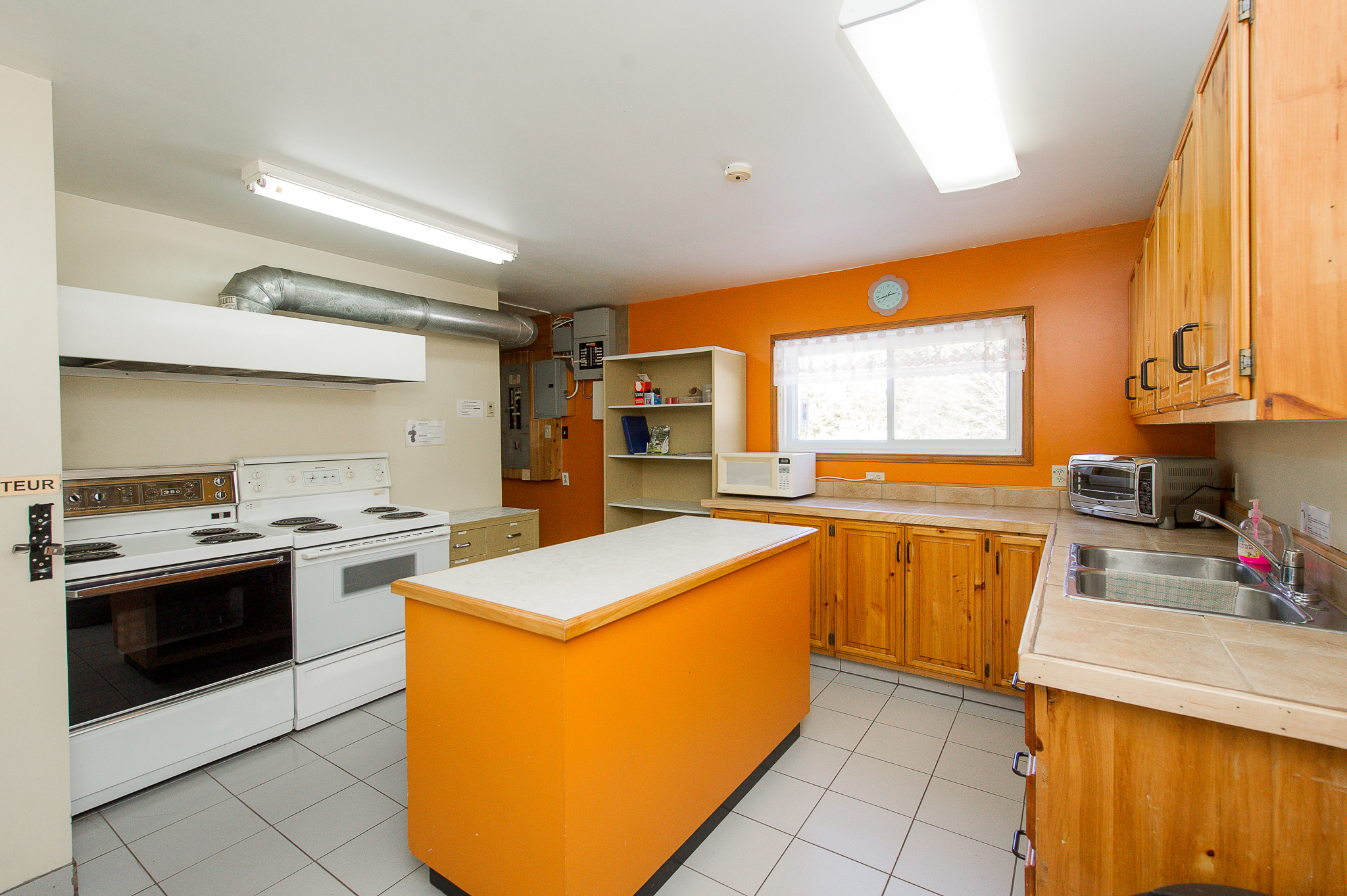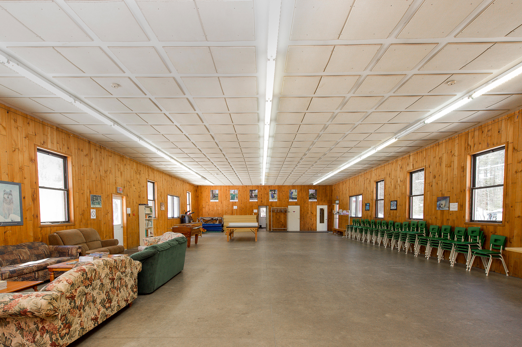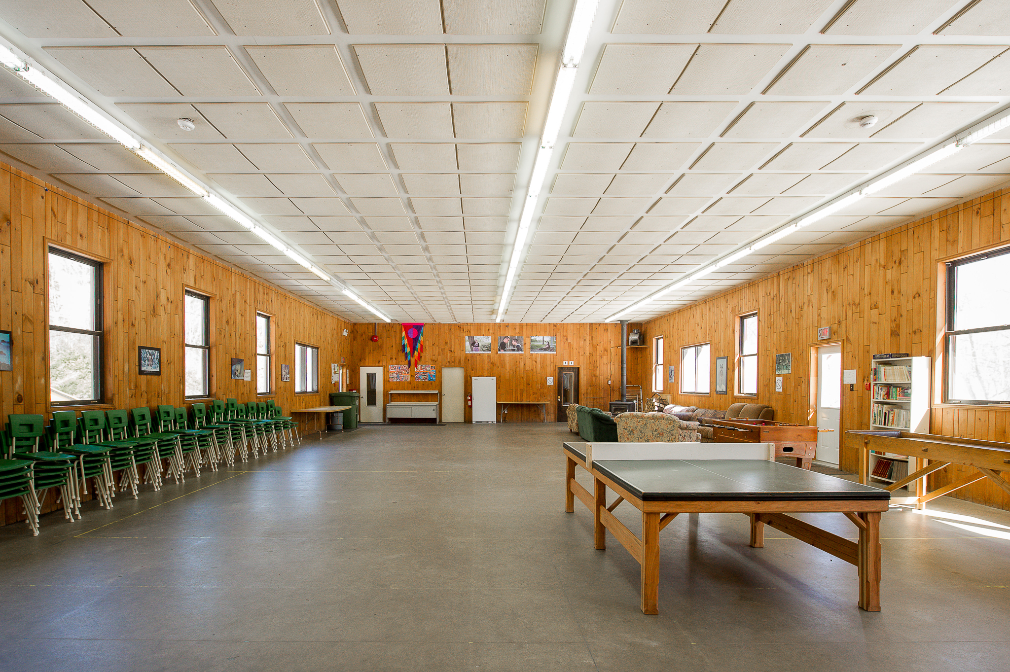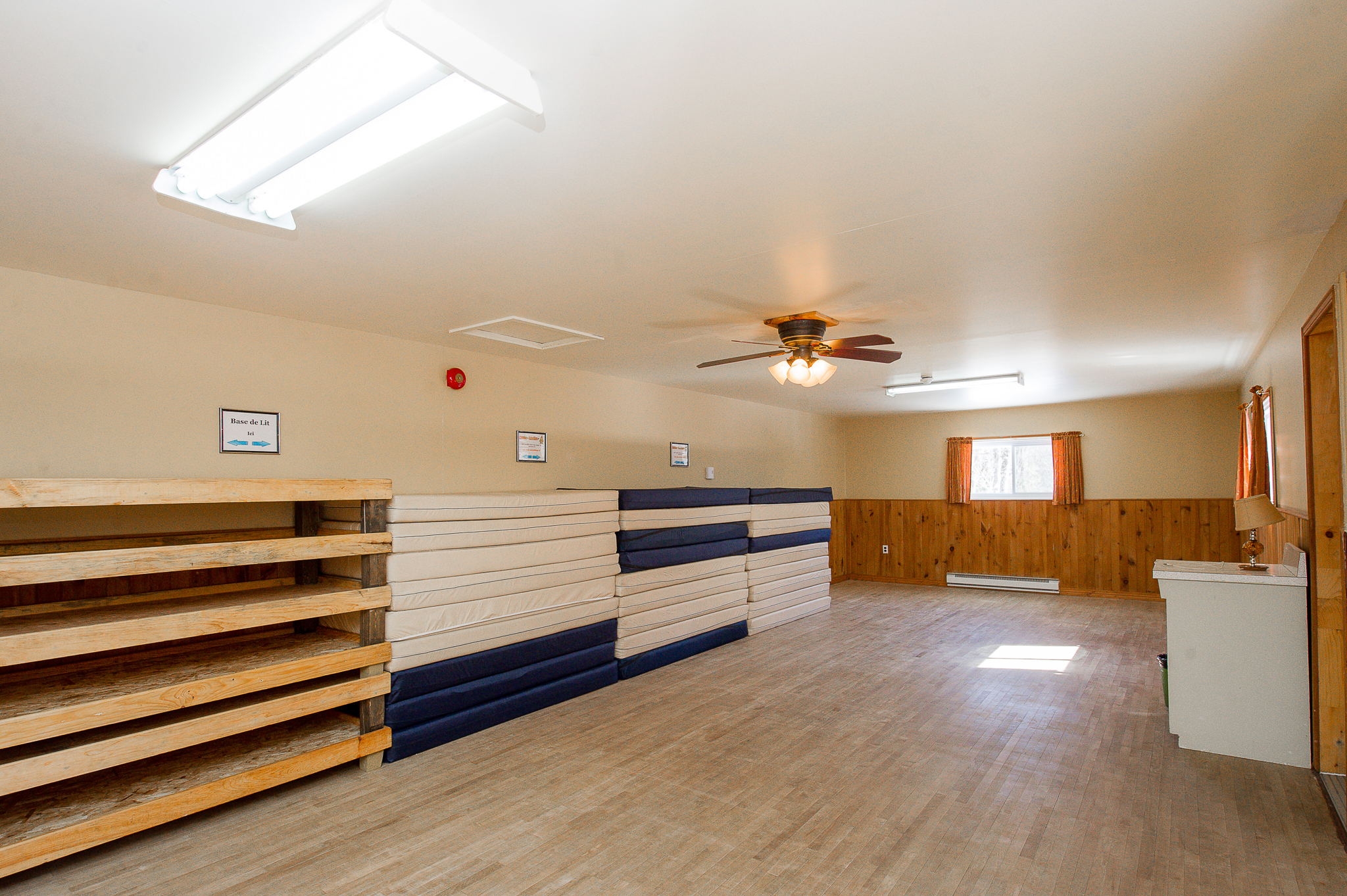 - Grande salle style gymnase de 35 par 70 pieds, muni d’un poêle à bois, peut servir de salle à manger, d’aire de séjour et de jeux ou de salle de conférence.