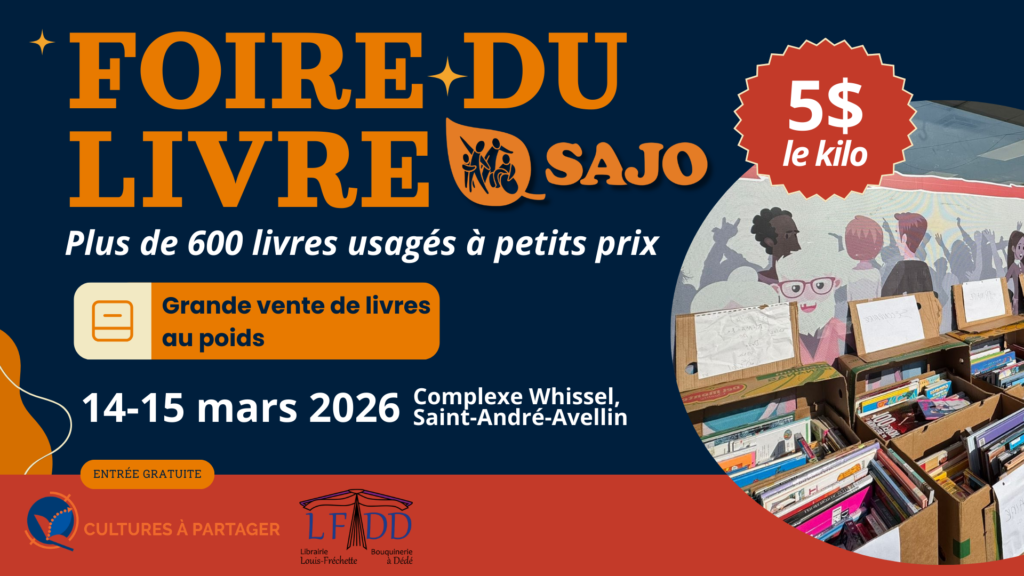 La toute première Foire du livre SAJO prendra place les 14 et 15 mars 2026, au Complexe Whissel de Saint‑André‑Avellin, de 10 h à 15 h. Organisé en partenariat avec La Bouquinerie à Dédé, l’événement proposera une formule simple et accessible : tous les livres sont vendus au poids, au tarif unique de 5 $ le kilo.