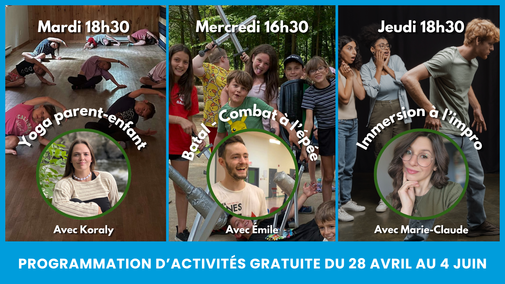SAJO lance sa toute première programmation de loisirs ouverte à la population. Pendant 6 semaines, dès la semaine du 27 avril 2026, nous offrirons des activités gratuites, variées et accessibles à tous afin d’encourager le mouvement, la créativité et le plaisir en communauté. Cette nouvelle programmation vise à rendre le loisir plus présent dans le quotidien des familles et à offrir des occasions simples, inclusives et rassembleuses de bouger et de s’amuser ensemble.